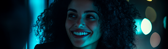 Mulher negra de cabelo cacheado usando óculos redondo e camiseta azul, em ambiente escuro e com luz azul, olhando para o celular e sorrindo