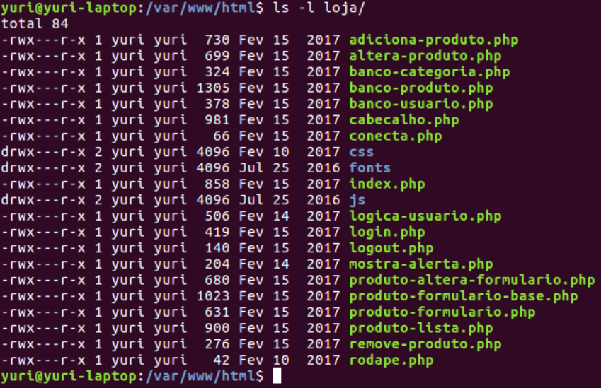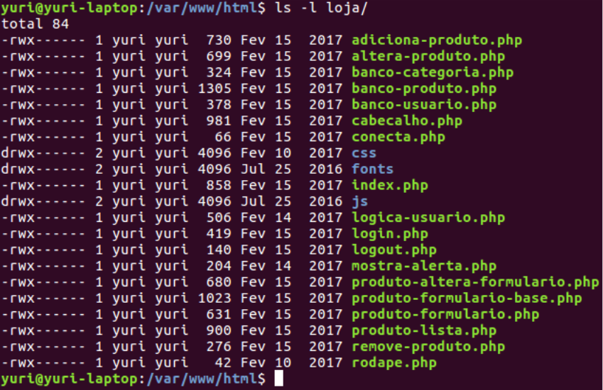 Sabendo disso, já conseguimos dizer qual a permissão do nosso projeto loja. O usuário dono tem todas as permissões (`rwx`), enquanto o grupo dono e o demais usuários não possuem nenhuma permissão (`---`).