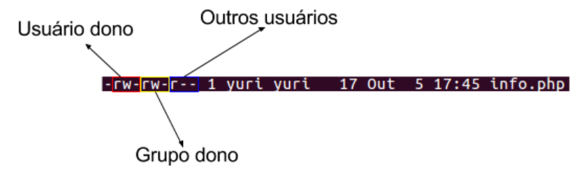 Essas permissões são divididas em três grupos: O usuário que criou o arquivo (usuário dono), o grupo dono do arquivo (que pode conter vários usuários), e as dos demais usuários que não pertencem ao grupo dono.