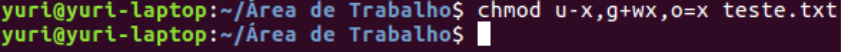 Nós podemos, por exemplo, falar para o `chmod` remover a permissão de execução do usuário dono do arquivo (`u-x`), acrescentar as opções de escrita e execução para o grupo dono (`g+wx`) e deixar os demais usuários apenas com a permissão de execução (`o=x`):