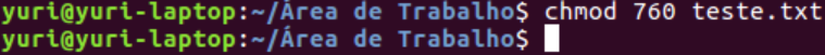 Para fazer o usuário dono ter todas as permissões (`7`) no arquivo, o grupo dono ter as permissões de leitura e escrita (`6`) e os demais usuários não tenham nenhuma permissão (`0`). Basta dizer isso ao `chmod`: